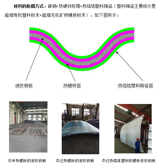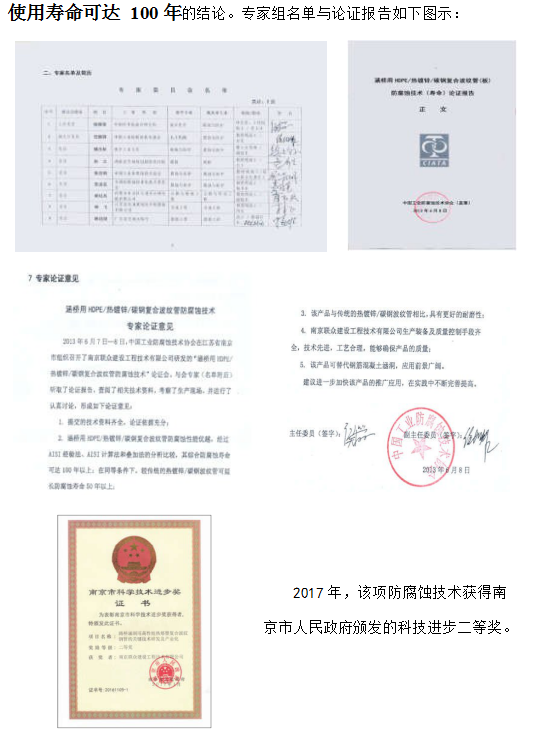 2010年,針對各地公路用熱鍍鋅波紋鋼管涵洞的腐蝕條件和行業(yè)防腐要求, 我公司與中國防腐蝕協(xié)會及南京工業(yè)大學、南京工程學院、中國石化集團金陵石化公司等單位合作研究,借鑒及創(chuàng)新了其它領域的高壽命的成熟防腐技術,將有機材料與無機超硬質礦物材料融合,成功的取得了埋地用鋼結構的熱浸鍍鋅加熱熔結塑料陶瓷的綜合防腐技術,并已在國內高速公路埋地式鋼質波紋管涵洞結構中運用,效果顯著,獲得行業(yè)好評。2017 年,該項技術獲得南京市人民政府頒發(fā)的科技進步二等獎。