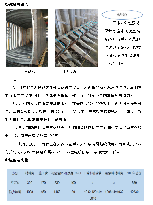 ⑨ 應對耐火極限三小時的方式是涂耐火涂料,但耐火涂料壽命只有 10~20 年, 并且不能長期耐潮,在壽命到期失效后重新涂刷時,由于內部管線及設施的存在, 清除殘余失效涂層的工作量大,涂刷新涂層更繁雜,費用較初次施工時大大增加, 并且在管廊整個壽命周期內要多次更換防火涂層;更為重要的是,耐火涂料只能阻止火災時鋼結構的溫度不高于 550℃,但對于鋼結構地下管廊來說情況特殊,在火災發(fā)生半小時左右,耐火涂料覆蓋的鋼結構體溫度就超過 150℃,廊體外部土壤中的水份形成高溫高壓蒸汽,其產生的次生災害有可能嚴重于火災本身。